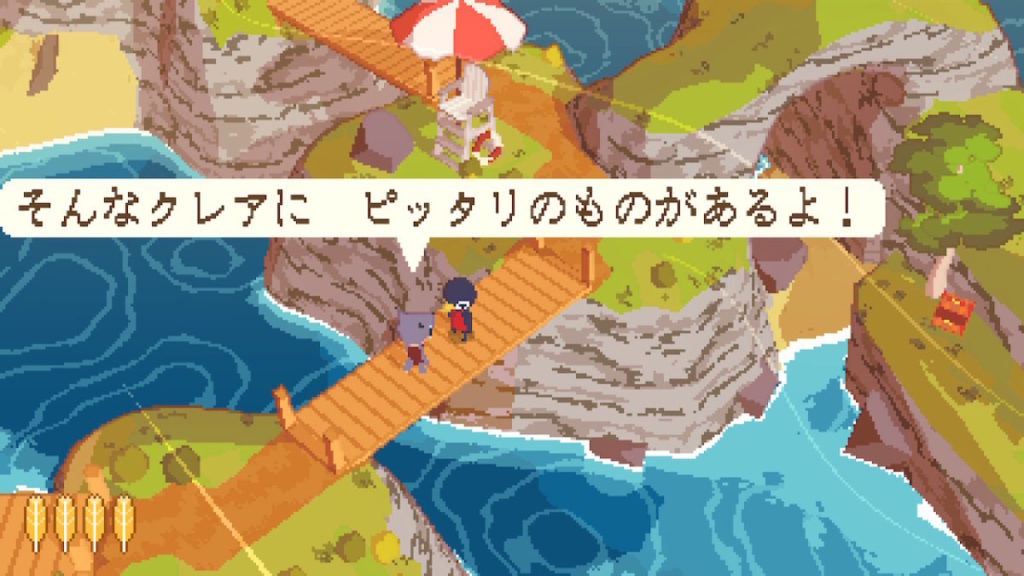 本作の主目的は山の頂上にたどり着くこと。そのためには黄金の羽根というアイテムをいくつか集める必要がありますが、それも含めて約2時間程度で到達できます。