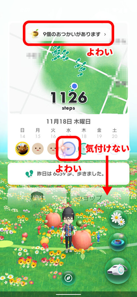 ピクミンをおつかいに出すと周囲の果実や苗を持って帰ってきます。楽しい機能ですが、並ぶものが変わり映えせず、ポケモンGOのような収集欲もわきません。