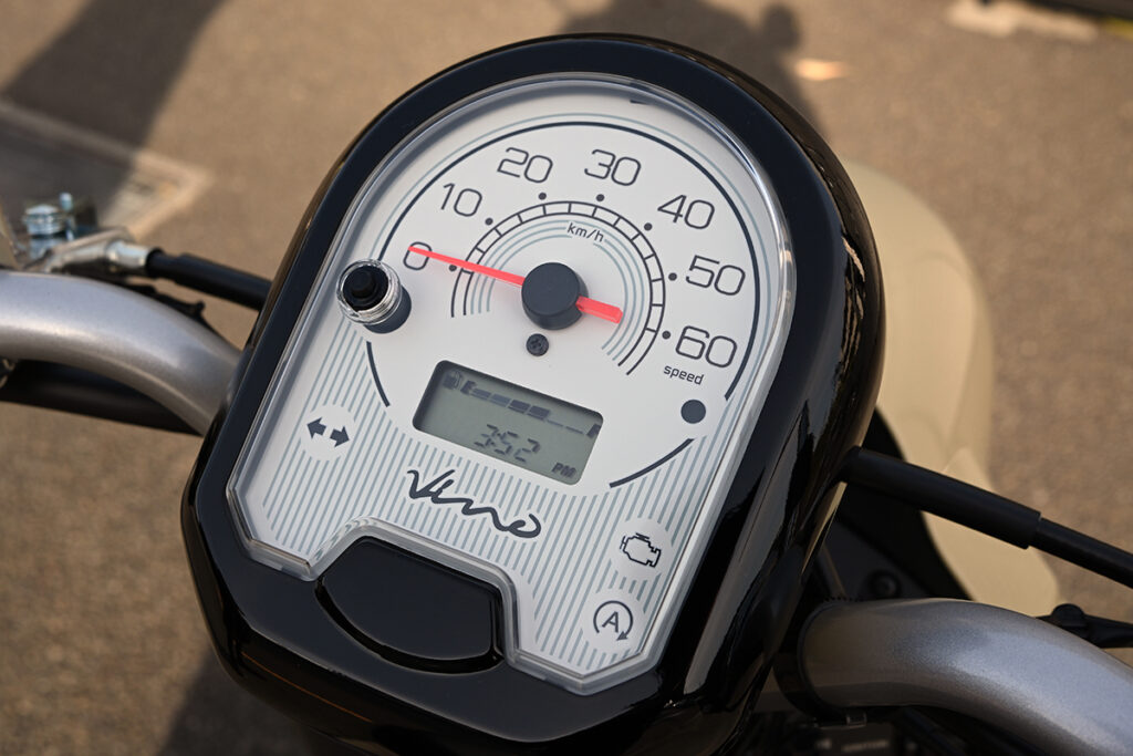 ガーリーなメーターは視認性が高くて良いです。液晶でガソリン残量、走行距離、燃費、時計なども確認できます。