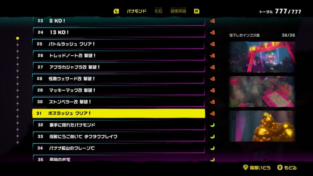 ちょっと残念だったのはバナモンドや化石をコンプリートしたときにマリオオデッセイのように讃えてくれなかったんですよね。追加コンテンツの都合でしょうか。もっとすごいね!エライね!と言って欲しかったです。
