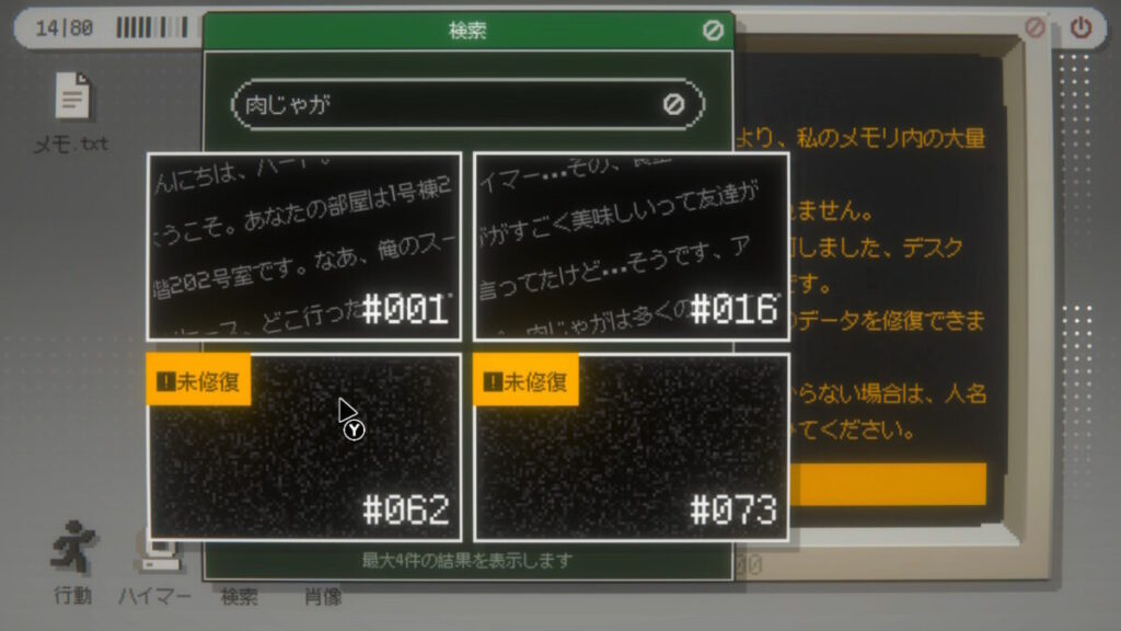肖像の中に含まれるワードを検索すると登場人物たちの会話のログデータが掘り起こされ、それもストーリーをつなぐヒントになります。