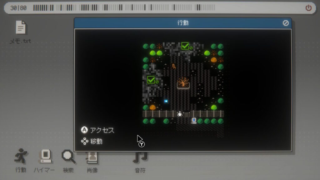 行動というアイコンをクリックするとウィンドウが開き、マップを移動できるようになります。