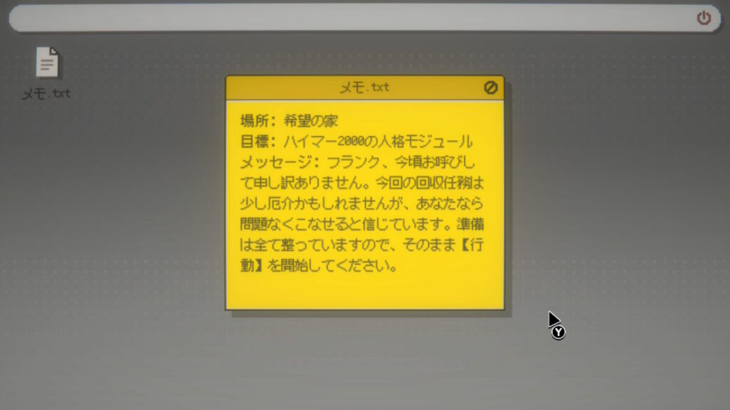 起動するとレトロなパソコン画面が表示されます。ハイマー2000というコンピューターを回収する任務を請け負っているようです。