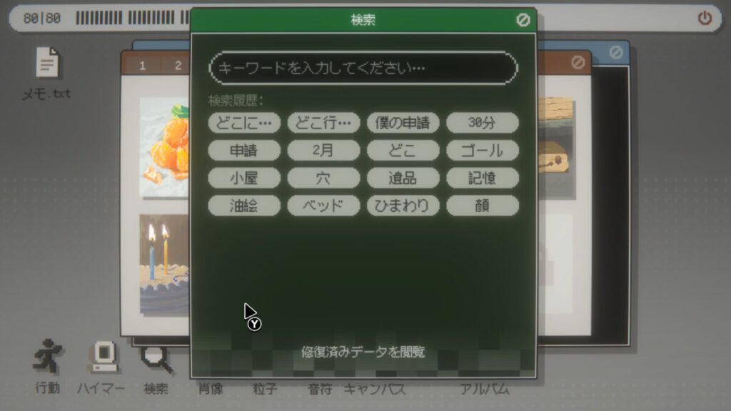 残念だったのは一部の検索ワードが表記ズレを許容しておらず、コンプリートを目指すと難易度が急激に上がってしまうところ。観念して攻略を見てしまいました。